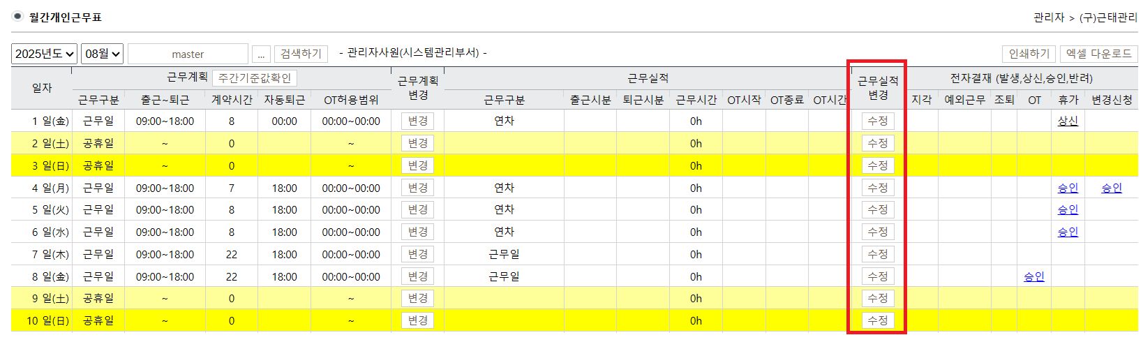사용자의 실수로 출퇴근 기록을 하지않았을 경우 관리자가 출퇴근값을 입력할 수 있나요?